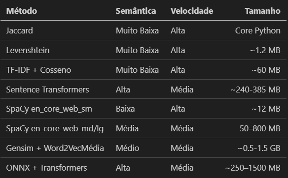 A seguir, duas tabelas comparativas entre os métodos avaliados para a implementação da técnica de comparação por similaridade semântica.